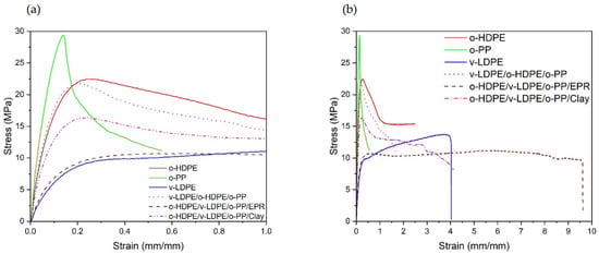 Mechanical properties of polymer blends made of ocean-bound plastic waste with a strain of (a) 0–1 mm/mm and (b) 0–10 mm/mm.