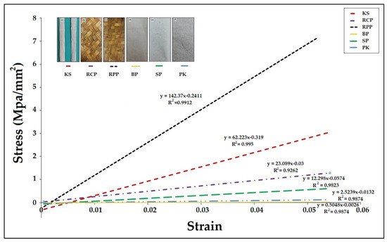 Young’s modulus was calculated using the linear graph slope of stress related to strain from the original point to the yielding point of all samples.