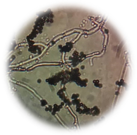 The type of fungi detected in Krajood strips was Aspergillus sp. (Figure 3), while Aspergillus sp. (Figure 4a), Curvularia sp. (Figure 4b), and Cladosporium sp. (Figure 4c) were observed in the paper made from Krajood.