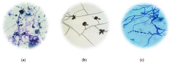 Morphology of the types of molds detected in paper made from Krajood. Aspergillus sp. (a), Curvularia sp. (b), and Cladosporium sp. (c).