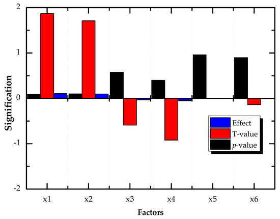 According to the bubble diameter results in Table 4, the largest and the smallest bubble diameters that were obtained from PB’s desired conditions were 1.073 ± 0.005 and 0.714 ± 0.016 mm, respectively. This demonstrates that the modified IAF could produce a small bubble size in the range of mm. The significance level of the assigned variables was then taken into account using a regression analysis with a Student’s t-test with a 95% confidence interval. The influence on the response factor was stronger when the variable had a small p-value and a high absolute T-value [23]. From the analysis of variance (ANOVA) in Figure 2 based on the p-value, the absolute value of the T-value, and its effective level, only two significant effect factors, including induced air tube diameter (x1) and a rotational speed (x2), were found to exhibit their significant roles in the generation of small bubble size by the modified IAF. In order to better understand the bubble’s hydrodynamic and mixing parameters from the modified IAF, these two factors were chosen to be analyzed in detail using CCD experiments.