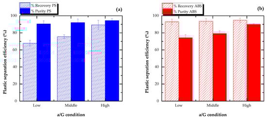 The plastic separation efficiency of (a) PS and (b) ABS at different a/G conditions.