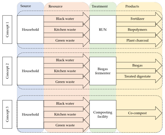 Alternative co-recycling systems (systems that consider different waste streams simultaneously) for black water and organic waste to those in developed cities that are resource-intensive and non-circular have the potential to reduce pollution and improve public health [14,15]. In addition, a regional circular economy can increase the resilience to environmental influences in communities [1]. This indicates a need for action worldwide, which is particularly advantageous in India when implementing new concepts by skipping traditional concepts.