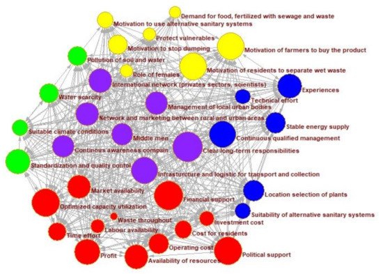 Social network analysis of indicators of co-recycling concepts between rural and urban areas from the view of thematic stakeholders. This is generated by using the cognitive mapping method (described in the material and method section). The indicators are represented by colored circles and the relation by lines. The larger the circle the higher its centrality and relevance for the concept. The color code is: green = ecological, yellow = social, blue = technical, red = economical, purple = connective.