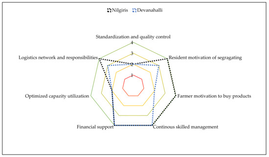 Site planning is another important aspect here to meet the needs of farmers, residents, and infrastructure, which is why the case study selection fell on semi-urban and semi-rural regions. Needs are, for example, the availability of resources, products, and markets as well as the elimination of middleman problems. In addition, it is the task of the central levels to look at the socially disadvantaged, such as waste pickers and smallholders so that they are not neglected in these concepts. In Nilgiris, women from socially disadvantaged backgrounds were offered a secure and better-paid job (compared to previous jobs) as a part of a self-help group in the co-composting facility.