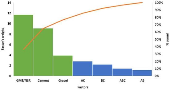From the Equation (3) above, in the constitution of the concrete, the constituents retained in the DOE showed the degree of the influence of each one on the concrete compressive strength. The “weight” of a factor indicates the degree of its influence on the compressive strength (Table 6). This calculated parameter (weight) is the double of the absolute value of the coefficient of the model term (Table 6). It quantifies the degree of influence of each factor on the observed response. It is clear that the NRS + GMT factor has the greatest weight and therefore the greatest influence on the concrete strength.