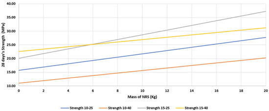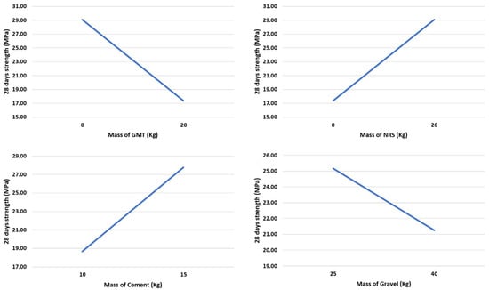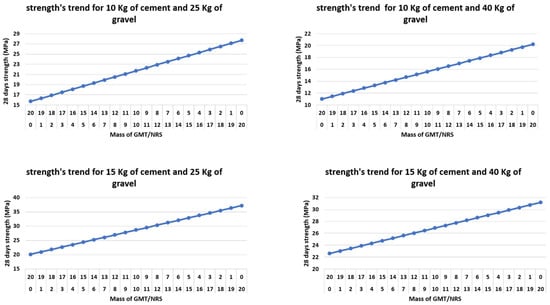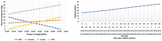 The compressive strength of each of the experiments of the DOE is shown in Table 5. The compressive strength on day 28 varied between 11 and 37 N/mm2. The compressive strength of 11 N/mm2 occurred when there was total substitution of NRS by GMT with: 20 kg of GMT (0 kg of NRS), 10 kg of cement and 40 kg of gravel. The strength of 37 N/mm2 corresponded to the dosage of 20 kg of NRS (0 kg of GMT), 15 kg of cement and 25 kg of gravel.