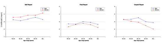 Mean scores for self-, paid, and unpaid repair by gender and age.