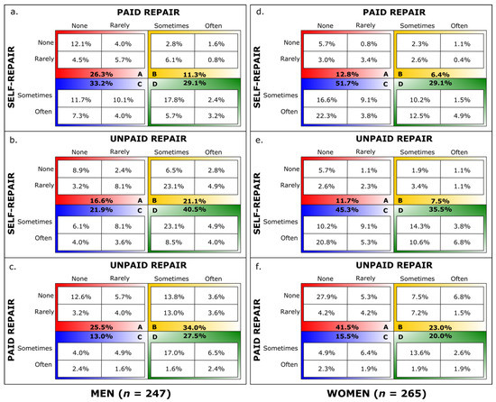 Among women, the preference for self-repair over the other forms was evident: 51.7% of women were in Quadrant C, showing high engagement in self-repair versus paid repair (Figure 2d); 45.3% were in Quadrant C, with, again, high engagement in self-repair but low in unpaid repair (Figure 2e). However, 40.5% of men were in Quadrant D, showing a high level of engagement in both self- and unpaid repair (Figure 2b), making up the largest proportion in the self-/unpaid repair cross-tabulation. Despite a clear preference for self-repair amongst women, just over one-third (i.e., 35.5%) indicated that they engage in both self-repair and unpaid repair, and 29.1% of women engaged in both self-repair and paid repair.