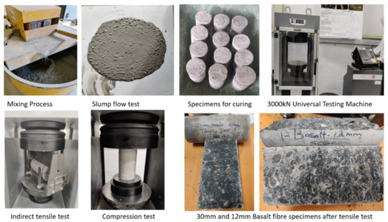 The water binder ratio of the mix is maintained at 0.45 water/binder content to maintain the workability required for the self-compacting geopolymer concrete. The mixing procedure involves two distinct stages, in the first stage, all the binder materials, alkali activator and chopped basalt fibres (if required) are added together and mixed for 4 min, and after that, the calculated water is added. The mixing is continued for 15 min until the required consistency is achieved. The fresh property of the mix is then assessed by the workability tests, including slump flow, and T500 tests, before the casting process [48]. The cylinder specimens are then cast into 100 mm (diameter) mould × 200 mm (height) and subjected to ambient curing for 28 days under laboratory conditions maintained at 23 ± 2 °C at Deakin University, Waurn Ponds Campus, Victoria. The Figure 2 below depicts the various stages of mixing and testing involved in the study.