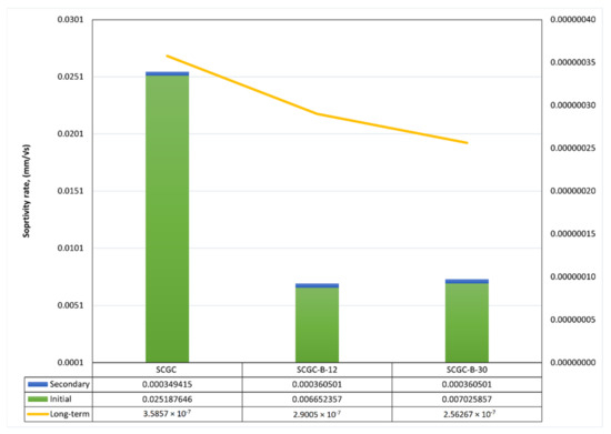 Sorptivity of SCGC, SCGC with 12 mm basalt fibres and 30 mm basalt fibres.
