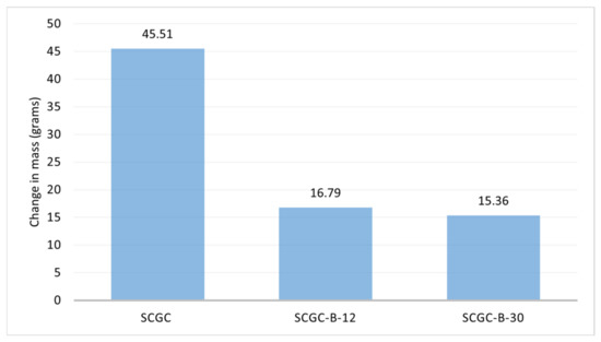The comparison above shows that the SCGC specimen without any chopped basalt fibres had a more significant rate of water absorption, reporting an increase in weight by 45 g compared to the overall weight increase of 16.79 g and 15.36 g of SCGC-B-12 and SCGC-B-30 specimens, respectively. It shows that the addition of 12 mm-long chopped basal fibres indicated a drop in water absorption by 63%. In comparison, adding 30 mm chopped basalt fibres offered a 66% decrease in water absorption, offering increased resistance to water ingress and other related chemicals, improving the durability of the newly developed self-compacting geopolymer concrete mix.