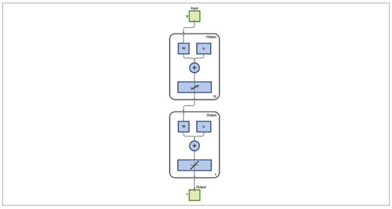 A forward feed network trained with the Levenberg–Marquardt backpropagation (LMBP) algorithm containing nine input parameters, fifteen hidden layers and one output is developed to predict the absorption rates of the geopolymer concrete specimens, as shown in Figure 15 below.