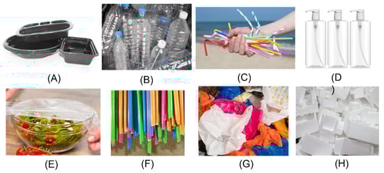 Plastic products used in pre-survey. (A) Black plastic food containers [49], (B) Water bottles [50], (C) Plastic straws [51], (D) Plastic soap dispenser bottle [52], (E) Cling wrap/Saran wrap [53], (F) Plastic broomstick/mop handle [54], (G) Plastic shopping bags [55], (H) Styrofoam packaging [56].