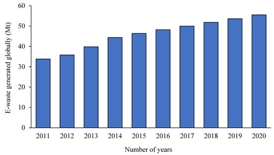 The annual production of e-waste was estimated to be 20–30 million tons by the United Nations Environment Programme (UNEP) and 4000 tons per hour globally, and the production is growing exponentially [3,9,10,11]. It was reported that 44.7 million tons of e-waste were generated in 2016, and it is estimated that by 2021, e-waste generated will have risen to 52.2 million tons annually and will continue to grow exponentially at a growth rate of 3% to 4% annually [12]. Figure 1 represents e-waste generated from 2011 to 2020, and this graph demonstrates the increasing e-waste generation worldwide.