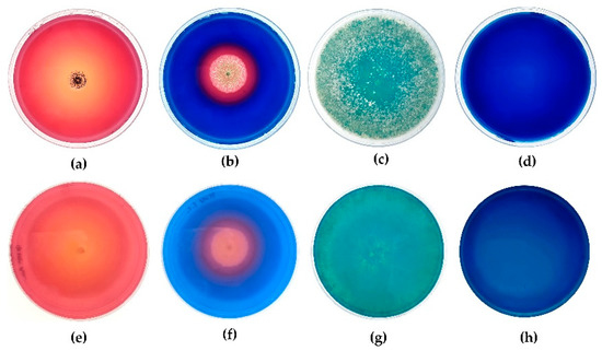 Figure 1 shows the blue CAS agar test of all the strains tested. In particular, A. tubingensis, as also reported in Table 2, had a stronger production of siderophores, showing a ratio of halo diameter/colony diameter more than three times greater than P. glandicola, while T. harzianum shows a partial reaction (expressed as a weak discoloration of the medium). The reactions were classified as: strong (the halo covers the entire plate and the ratio is ≥3), moderate (the halo does not cover the entire plate but exceeds the edge of the colony and the ratio is 3 ≤ 1), weak (the halo coincides with the edge of the colony or is evident as only a discoloration of the medium, and the ratio is ≥1).