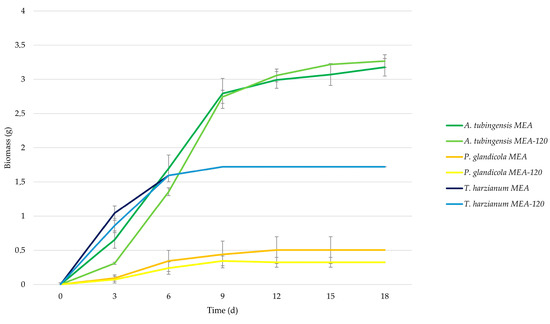 In order to compare the growth in the MEA and in the MEA-120, the tolerance index was calculated based on fungal dry weight. This index corresponds to the ratio between the biomass grown on MEA and MEA-120, as reported in Equation (1), during the 18 days of growth.