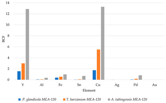 Figure 3 reports the BCF values after 18 days of incubation for the strains grown on MEA-120. Although all the strains can concentrate some elements, A. tubingensis is the best performing. Further information about the recovery capability may result from the comparison among the bioaccumulation data, related to the total amount of biomass produced. This result is strictly related to the highest biomass production of A. tubingensis compared to the other strains (see Table 3) and confirms the BCF trend (in Figure 3); moreover, the highest BCF values make A. tubingensis the best candidate for the whole recovery process.