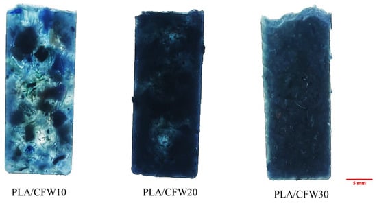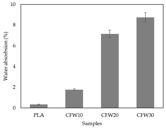 - Water absorption testing showed that an increase in the CFW content resulted in the composites having greater water absorption; the highest was 8.76% when compared with pure PLA.