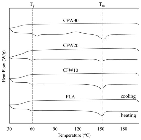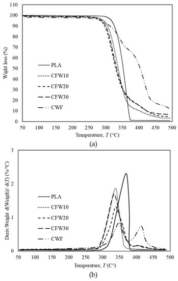 - Thermal property testing, in terms of DSC, showed that an increase in the CFW content caused the Tg and Tm of the composites to slightly increase; the highest were 66.31 °C and 153.54 °C, respectively. The crystallinity increased by approximately 36% compared with pure PLA, but an increase in the CFW content did not clearly change the results. The DSC thermograms of the composites showed one peak, indicating an immiscible blend of PLA and CFW. This could imply that the finishing and dying agents that may remain in CFW did not affect the melting point of the composite. In terms of the TGA, the result showed the decomposition of the composites to be lower than pure PLA. The temperature of both the Tonset and Tpeak of the composites decreased with an increase in the CFW content. The decomposition of the composites was shown in a range of 302.41 to 361.22 °C.
