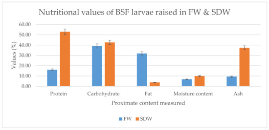 Among other nutrients, the analyzed percent of crude protein of BSF larva raised in SDW (53 ± 0.005) showed a significant difference from the crude protein of BSF larva raised in FW (16 ± 0.006) at (t ˂ 0.05). Other studies conducted in the past three years reported that the crude protein (CP) values obtained from BSF larvae reared on different substrate are as follows; fruit waste 12.9% [20], chicken manure 42.2% [44], and brewery waste 44.52% [45]. Among all the substrates that were reported to raise BSF larvae, the use of SDW in this study showed a high percent of crude protein (53 ± 0.005). The difference can be observed in Figure 1.