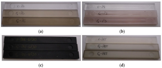 Examples of the injection-moulded specimens: (a) PC; (b) PS; (c) PA6-GF30; (d) PET.