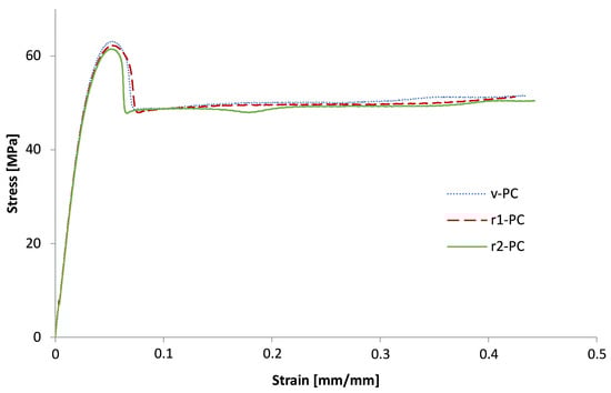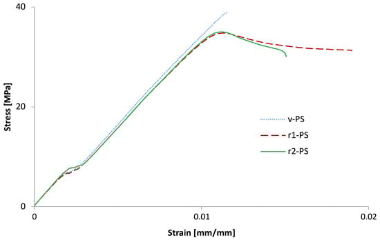 The most representative test to evaluate mechanical properties is the tensile test. In this work, the test was carried out according to the guidelines in ISO 527:2019 [23], with the objective of understanding if the ability to deform elastically would change with the recycling process and if tensile strength would suffer any significant modification. The results of the tensile tests for the PC, PS, PA6-GF30, and PET virgin and recycled specimens are shown in Figure 3, Figure 4, Figure 5 and Figure 6. The corresponding values of Young’s modulus (E) and tensile stress (σy) are shown in Table 5.