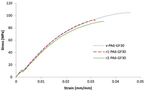 Stress–strain curve of each processing cycle of PA6-GF30.