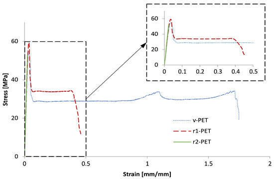 The changes in mechanical properties (Figure 6) from v-PET to r1-PET can be related to the higher melt flow rate, as shown in Table 5, which might promote higher molecular orientation. After a second recycling cycle, the results show that there is a notorious loss of properties, displaying the characteristics of a fragile material.