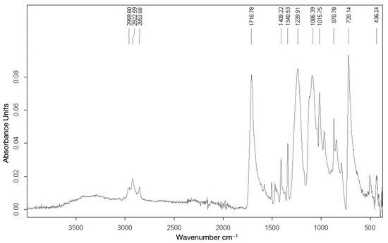 Figure 7 shows the spectre of the virgin PET used throughout this study. The results were corroborated by comparing this material with the literature (Table 6) [24,25].