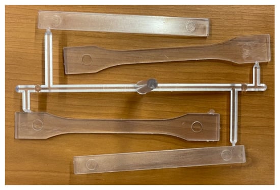 The processing method to obtain the recycled materials was injection moulding through a EUROINJ D80 from LienYu Machinery Co., Ltd. (Tainan, Taiwan) injection machine with a clamping force of 80 tons. The materials were injected into a cavity with geometry to obtain tensile and flexural specimens (Figure 8).