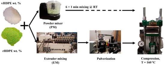 - Cestari, S.P.; Martin, P.J.; Hanna, P.R.; P. Kearns, M.; Mendes, L.C.; Millar, B. Use of Virgin/Recycled Polyethylene Blends in Rotational Moulding. J. Polym. Eng. 2021, 41, 509–516. [Google Scholar] [CrossRef]