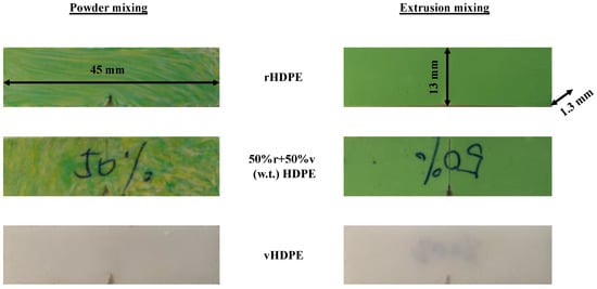 - Ramírez-Vargas, E.; Sandoval-Arellano, Z.; Hernández-Valdez, J.S.; Martínez-Colunga, J.G.; Sánchez-Valdés, S. Compatibility of HDPE/Postconsumer HDPE Blends Using Compatibilizing Agents. J. Appl. Polym. Sci. 2006, 100, 3696–3706. [Google Scholar] [CrossRef]
