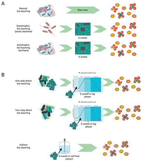 Bioleaching: mechanisms and strategies. (A) Heterotrophic and autotrophic bioleaching occurring in natural minerals deposits and in e-waste recovery processes resulting in free metal ions and metal oxides; (B) Direct (one-step and two-step) and indirect approach to bioleaching process. In direct bioleaching, e-waste is introduced during the initial microbial growth phase (one-step) or exponential growth phase (two-step). In indirect bioleaching, only microbial metabolites interact with e-waste.