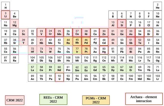 Periodic table of elements categorised as Critical Raw Materials in 2022, comprising PGMs and REEs as listed in Table S1 [13,14]. The red squares represent archaea-element interactions described in the present work.