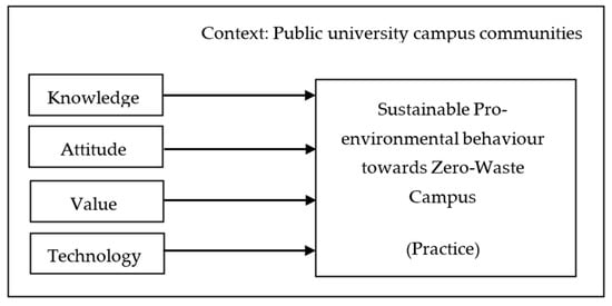 There are three essential identification domains in KAP surveys: Knowledge, Attitude, and Practice. In this study, knowledge refers to acquiring, retaining, and applying information combined with experience and skills gained from zero-waste education and experience. Attitude is a degree of favour or disfavour, or feelings of identifying the main factors contributing to the campus’s MSW problem. While practices refer to the participant’s actions towards improving the MSW problem and creating a zero-waste campus. It is a model feature that aids in understanding how knowledge relates to attitude and practice towards PEB. It also enables this study to be completed within limited financial and time constraints. Values are an affective domain of a human [55], which involve the internalisation of emotion and feeling. In this study, the KAP Model was slightly modified to recognise the importance of value, as mentioned by Kollmuss and Agyeman [47]. In a recent study, values are an essential factor in determining PEB [56,57]. In this study, value is defined as accepting a zero-waste phenomenon or behaviour concerning worth, excellence, usefulness, or importance, where specific emotions that affect behaviour are identified. Whereas Redclift et al. [58] highlight that values are often negotiated, transitory, and contradictory.