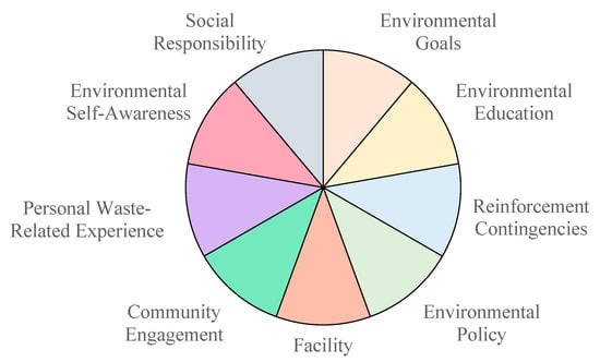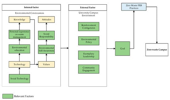 Universities have diverse organisational cultures that value and promote learning. Thus, they can play an essential role in educating new generations of citizens and leaders [17]. Additionally, university campuses can be viewed as small cities for their extensive coverage, population size, and numerous complex activities, which may or may not impact the environment [18]. Thus, solving the MSW problems on the campus grounds could be applicable and adopted by the government at the national level to devise suitable strategies to enhance public awareness and participation in promoting PEB towards a zero-waste goal. On a negative note, Malaysian universities are claimed to contribute to solid waste generation in the country [19]. Therefore, it is important to study why this occurs by examining and comprehending the university campus community’s perspective on the matter.