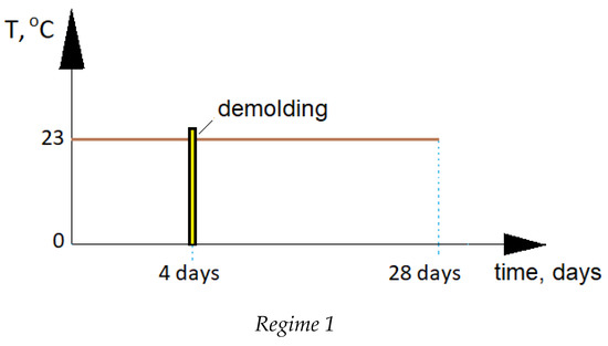 Regime 1: Curing in ambient conditions with relative humidity (RH) ≈ 42% and temperature 23 ± 3 °C for 4 days → demolding and further curing in ambient conditions until testing at the ages of 4, 7, and 28 days were performed.