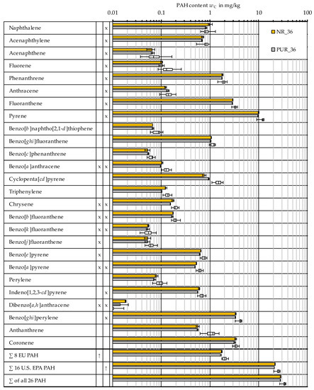 The PAH content was determined analytically for two selected blends (NR_36 and PUR_36 according to Table 2) by means of hot extraction with toluene (Grimmer method). The results are summarized in form of bar graphs in Figure 1. The sorting of the PAH compounds is performed from top to bottom with increasing retention time. In the second and third columns, the eight EU PAH as well as the 16 U.S. EPA PAH are marked with an “x”. Detailed measurement results can be found in Table A1 (Appendix A).