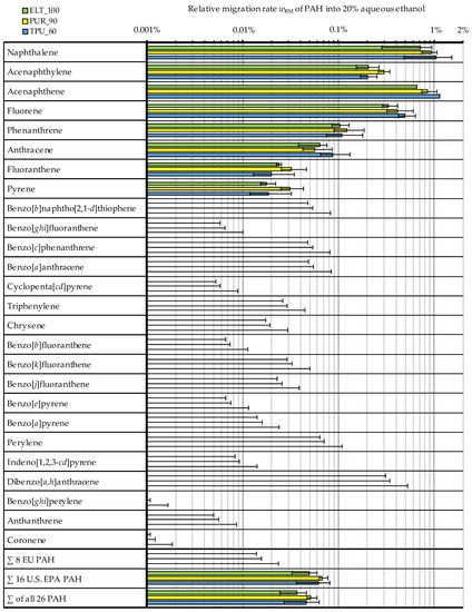 The highest migration would be expected for the two materials ELT_100 and PUR_90. They either consist entirely of ELT and have a rough surface (ELT_100) or have the highest ELT content of all blends, the surface of which is in direct contact with the migration medium over a large area (PUR_90). However, Figure 2 (right) reveals that it is the two blends with the lowest ELT content, PUR_36 and NR_36, that exhibit the highest ELT-content-related migration rate. The absolute amounts of migrated PAH are even comparable to those of ELT_100 and PUR_90. This is unexpected since these materials are only one-third ELT and these are fully embedded in the matrix and thus have no direct contact with the migration solution. According to the JRC report [11], a barrier effect would be expected here, where the release of PAH might be up to three times lower compared to uncoated ELT. Comparing TPU_60 with ELT_100 on the other hand, migration scales relatively well with ELT content, but this still does not indicate a barrier effect of the matrix. Figure 3 and Figure 4 present the relative migration rate wRM, where the amount of migrated PAH mE was set in relation to the amount of PAH mC contained in the test specimens (see Table A3). In cases where a migration of individual PAH compounds was not detectable, the LOQ (see Table A2) was taken to calculate the maximum (error bar) for them and the sum parameters. This provides an estimation for the uncertainty resulting from the limit of quantification.