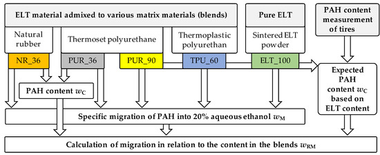 In this study, the migration of PAH from blended materials, which contain ELT material in significant amounts, into 20% aqueous ethanol (Brenntag, Essen, Germany) is characterized. The experimental setup is shown schematically in Figure 5.