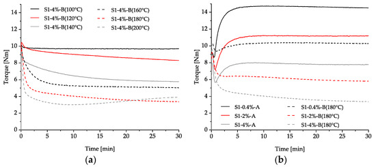 Rheometer curves recorded at 100 to 200 °C for S1-4%-B (a) and 180 °C for S1-0.4%, S1-2%, and S1-4% with (A) and without (B) a curing system (b).