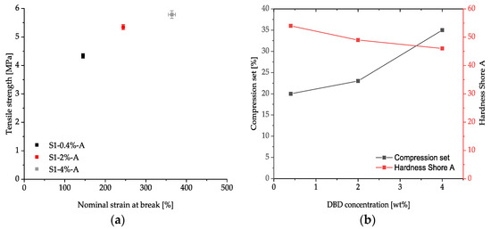 Tensile strength and nominal strain at break (a) and compression set and hardness Shore A (b) of S1-0.4%-A, S1-2%-A, and S1-4%-A.