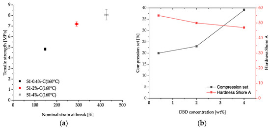 Tensile strength and nominal strain at break (a) and compression set and hardness Shore A (b) of S1-0.4%-C (160 °C), S1-2%-C (160 °C), and S1-4%-C (160 °C).