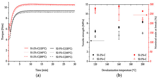 A higher devulcanization temperature leads to stronger network degradation (minimum torque in the rheometer curves) and better tensile strength (Figure 4b). The strain at break decreases slightly. For a good quality recyclate, low temperatures are preferable [26]. The tensile strength and nominal strain at break are higher for all temperatures in S1 compared to S2. The additional components in S2 do not lead to a higher degree of devulcanization or better mechanical properties. For cost and environmental reasons, S1 should be used over S2 to devulcanize EPDM.