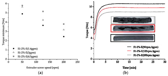 Torque minimum of S1-2%-E as a function of screw speed and flow rate (a) and rheometer curves recorded at 180 °C of S1-2%-E (3 gpm) with pictures of the ext ruded material (b).