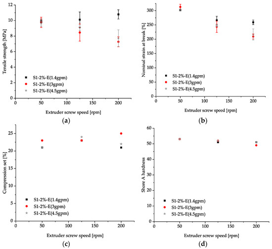 Tensile strength (a), nominal strain at break (b), shore A hardness (c), and compression set (d) of samples S1-2%-E as a function of screw speed and flow rate.
