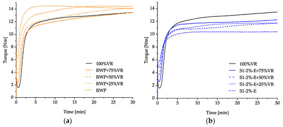 Rheometer curves of VR blends with untreated RWP (a) and S1-2%-E (50 rpm, 4.5 gpm) (b).