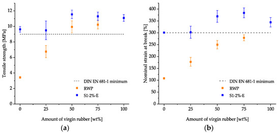 The tensile strength (a) for S1-2%-E exceeds the requirements at all blend ratios, while for untreated RWP the tensile strength decreases, and the specifications are no longer met at ratios above 50 wt% RWP. As indicated in the experimental part, the nominal strain at break was determined here (b), but the given elongation at break in the DIN EN 681 applies to the determination with an extensometer. Since the nominal strain is 30% lower and all values for S1-2%-E are around 300%, the DIN requirements were thus fulfilled. For the RWP specimens, the requirements were met only up to a maximum of 50 wt%. This deterioration of the properties of the RWP is related to the formation of a second phase by the immiscible crosslinked particles, in which a different stress distribution prevails due to this heterogeneity [58]. Another cause of the revulcanizates’ inhomogeneity is the diffusion of sulfur into the RWP [59,60].