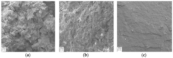 In Figure 11, SEM images of the blends are depicted. The RWP (a) shows a rough fracture surface, indicating the size of the original particles [30]. The devulcanized RWP S1-2%-E (b) shows an irregular surface with smooth structures, suggesting that the particles have decreased in size due to devulcanization. The reference shows a smooth surface with only small fissures (c).